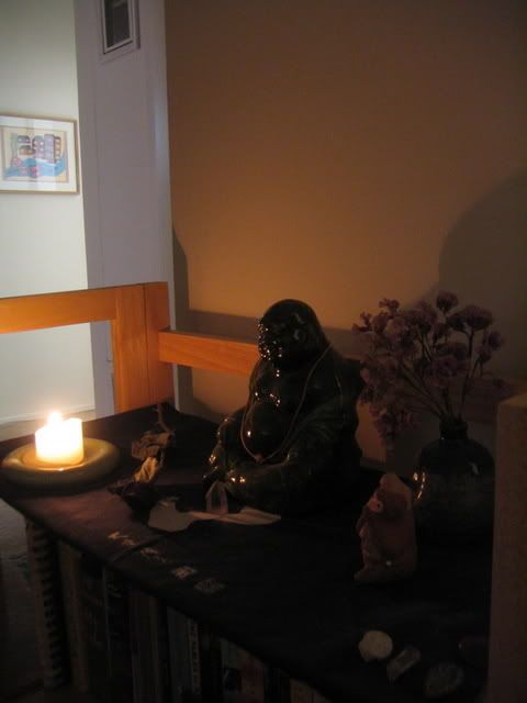 the items on my alter were given to me. the green buddha belonged to my best friends parents in the 70's (it's hollow and they used to it stash drugs!), the alter cloth was a gift from dokai from japan, the monkey shaped incense holder a gift from my aunt from china, the dried rose from roshi after jukai, the candle holder was made by a co-worker in her ceramics class, and the various stones i picked up on my travels. i recently added a frame with 4 photos of buddha statues (representing the various stages of his life) i took while in india.